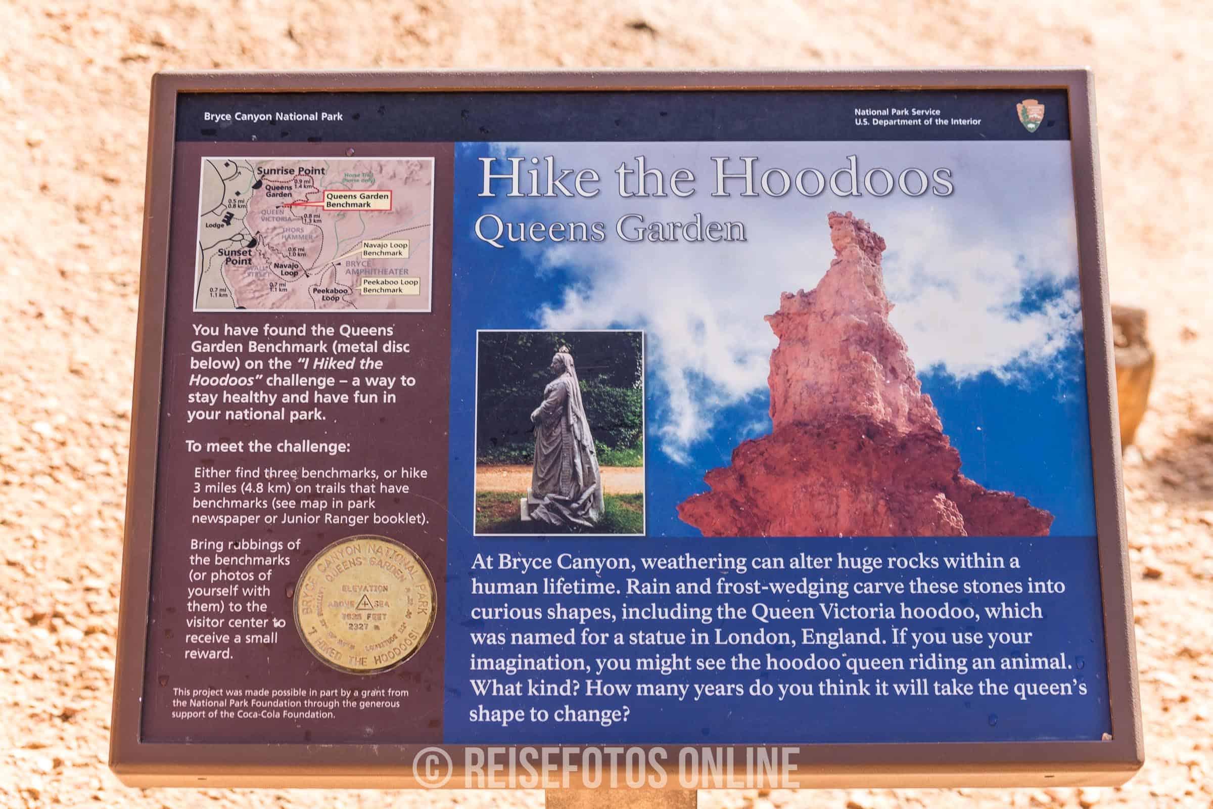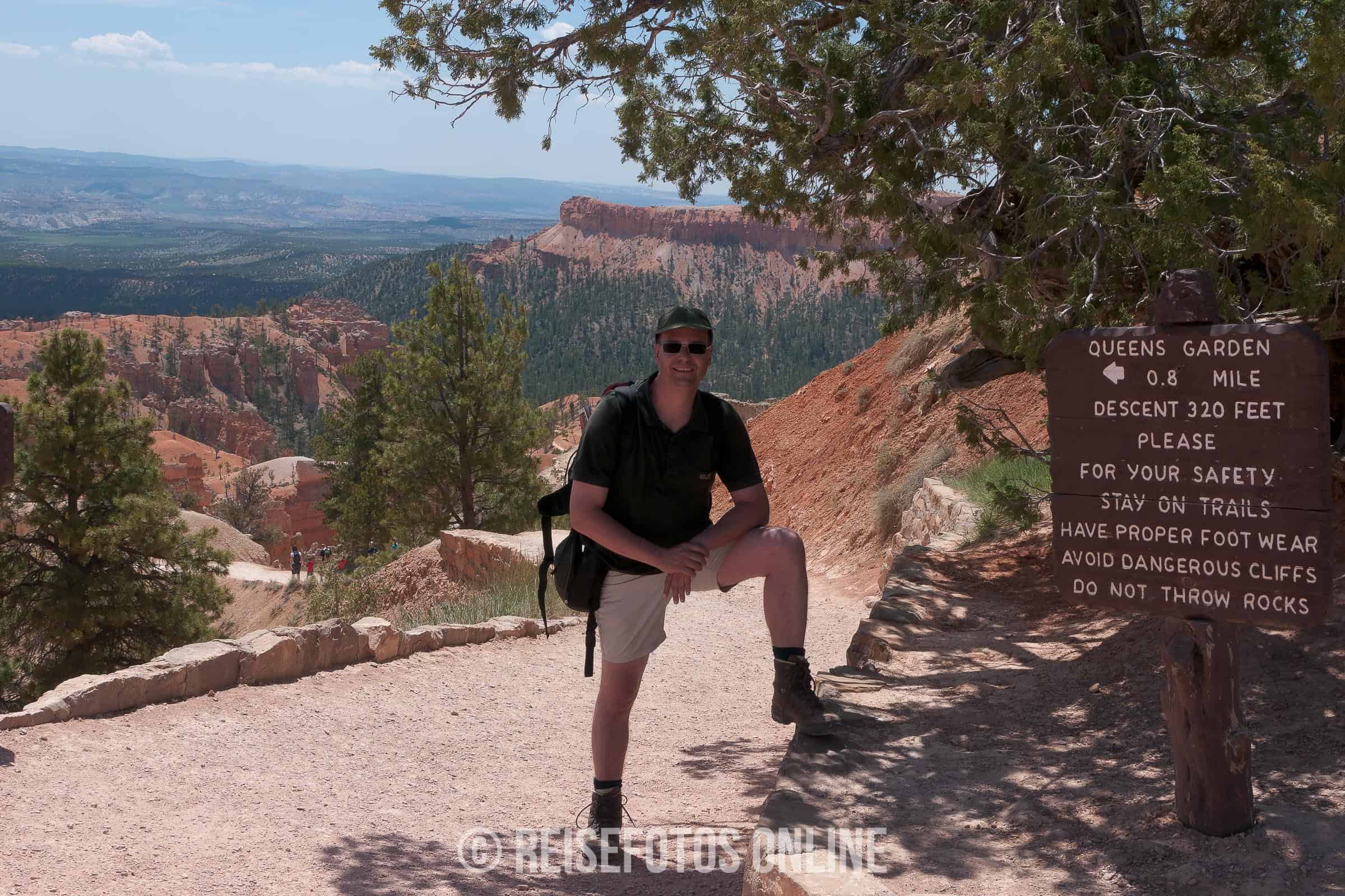 Durch den Park führt eine etwa 29 Meilen (ca. 47 km) lange Scenic Route mit 13 Aussichtspunkten, so daß man den Park ausgezeichnet mit dem Pkw erkunden kann. Allerdings ist das wirklich nur etwas für die ganz eiligen. Man verpasst dann schon einiges. Wir empfehlen Euch mindestens eine kurze Wanderung nach unten zu unternehmen. Der Queens Garden Trail ist nur knapp 1,5 Kilometer lang und eignet sich hervorragend den Canyon von unten zu sehen. Allerdings sind trotz der kurzen Wegstrecke recht anstrengende Steigungen enthalten. Nehmt genügend Wasser mit, denn im Sommer wird es sehr heiß – unterschätzt das nicht.