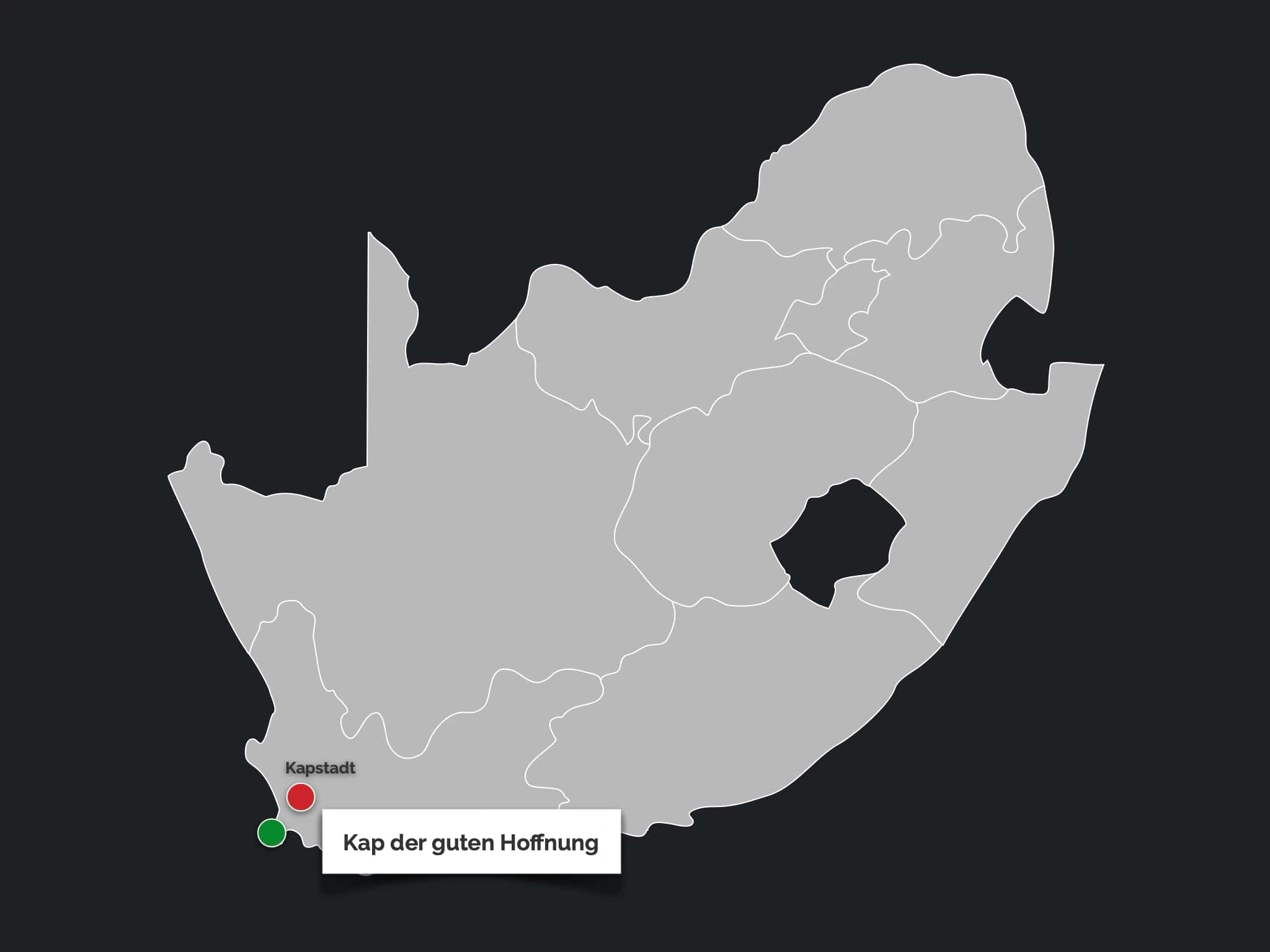 Die Fahrt zur Südspitze der Kap-Halbinsel gehört zu den Höhepunkten eines jeden Kapstadt-Besuchs. Tatsächlich bietet die Region gleich zwei markante Kap: den Cape of Good Hope – Kap der Guten Hoffnung und den etwas weiter südlich und deutlich höher gelegenen Cape Point. Für uns überraschend ist keiner dieser beiden Punkte der tatsächliche südlichste Punkt Afrikas. Dieser befindet sich etwa 150 km südöstlich am Cape Agulhas, wo nach wissenschaftlicher Übereinkunft der Atlantische und der Indische Ozean (theoretisch) aufeinandertreffen.