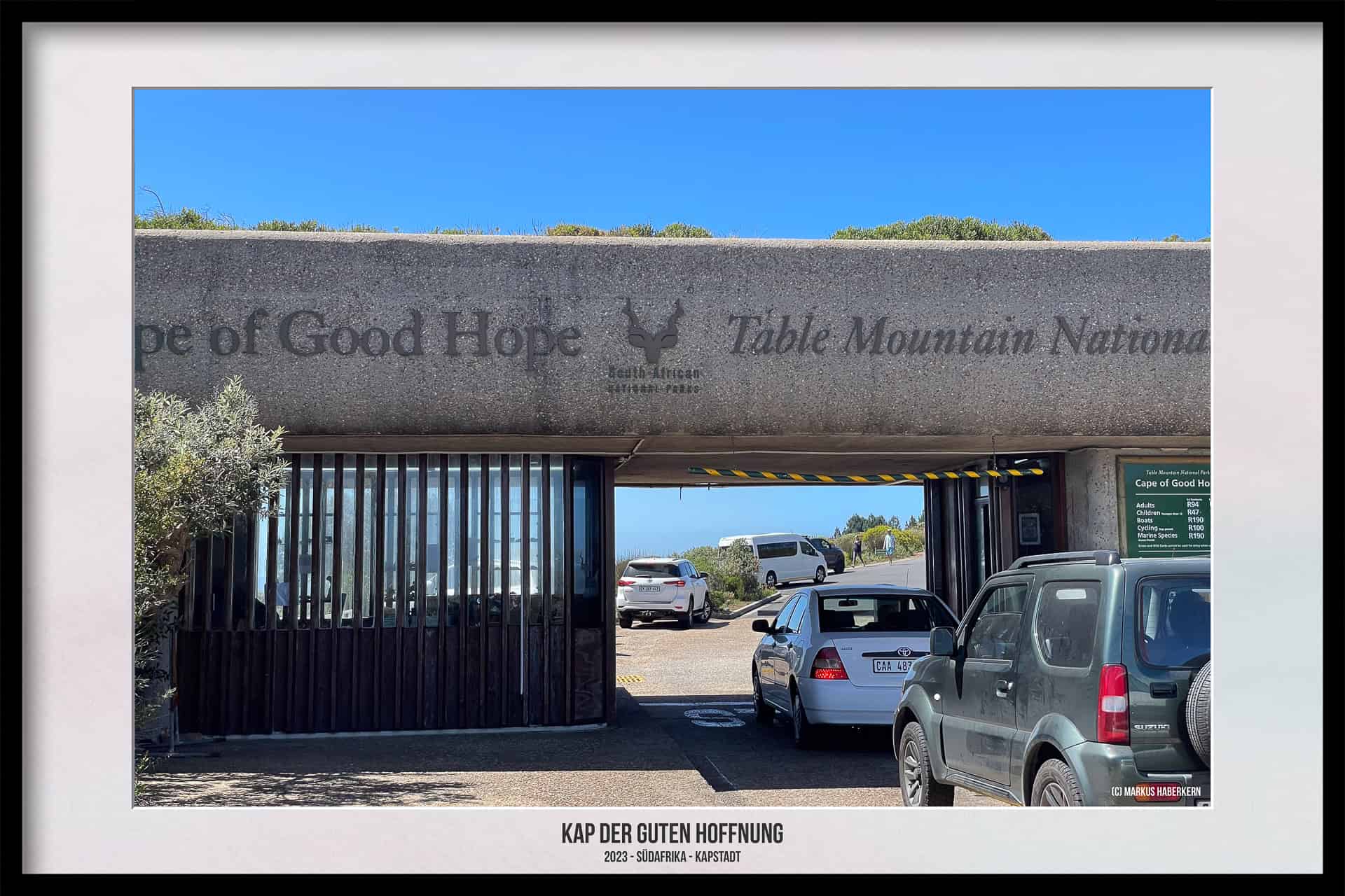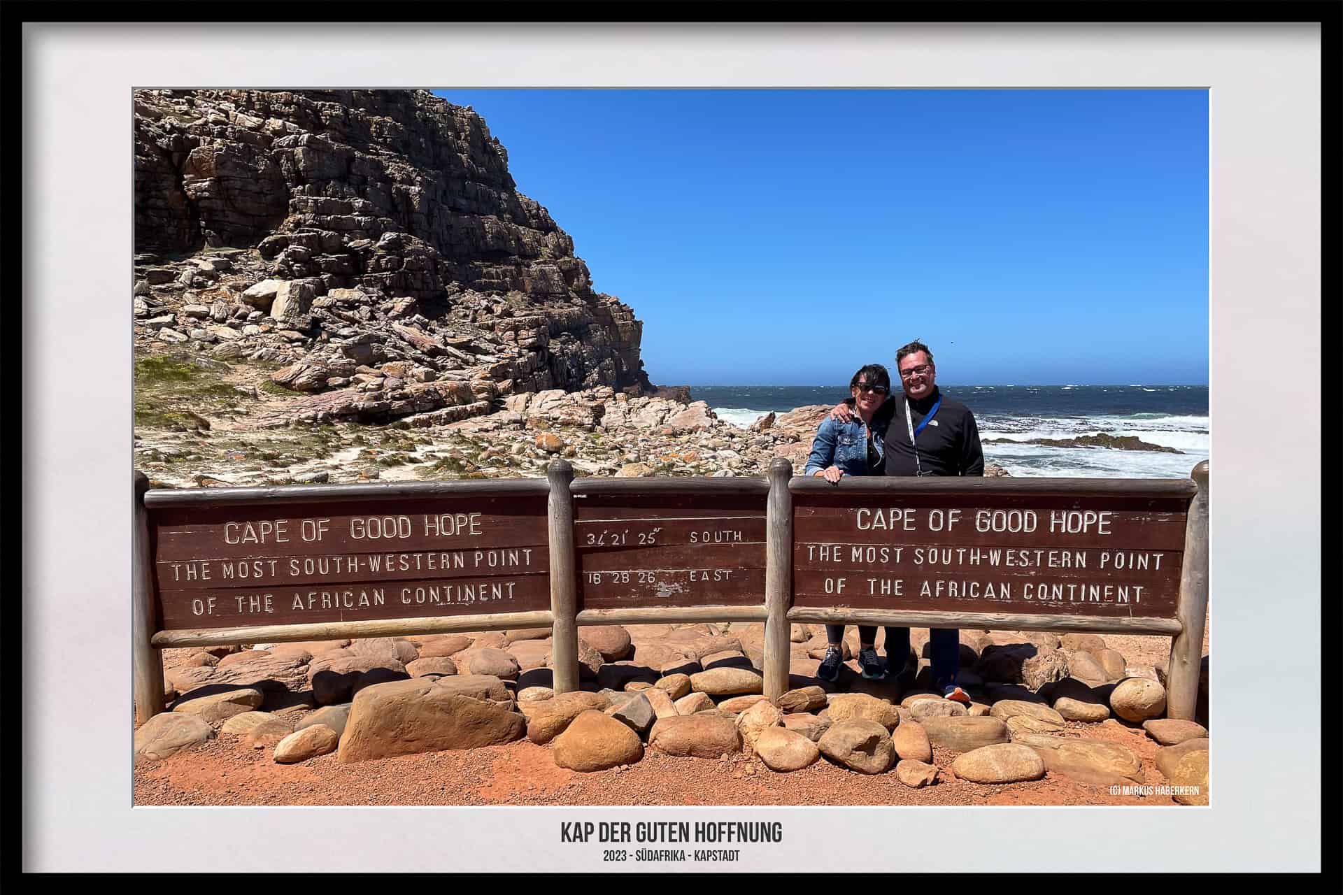 • Das Kap der Guten Hoffnung – Cape of Good Hope. Der südwestlichste Punkt Afrikas – also nicht der südlichste und auch nicht der westlichste. Man kann auf dem recht kleinen Parkplatz halten und dann direkt die wenigen Meter bis zu dem berühmten Schild gehen. Wer aber meint, er ist dort alleine, wird sich ganz schön wundern. Wir hatten Glück und die Schlange war nur recht kurz, aber kurz danach kamen zwei Reisebusse und es war aus mit der Ruhe.