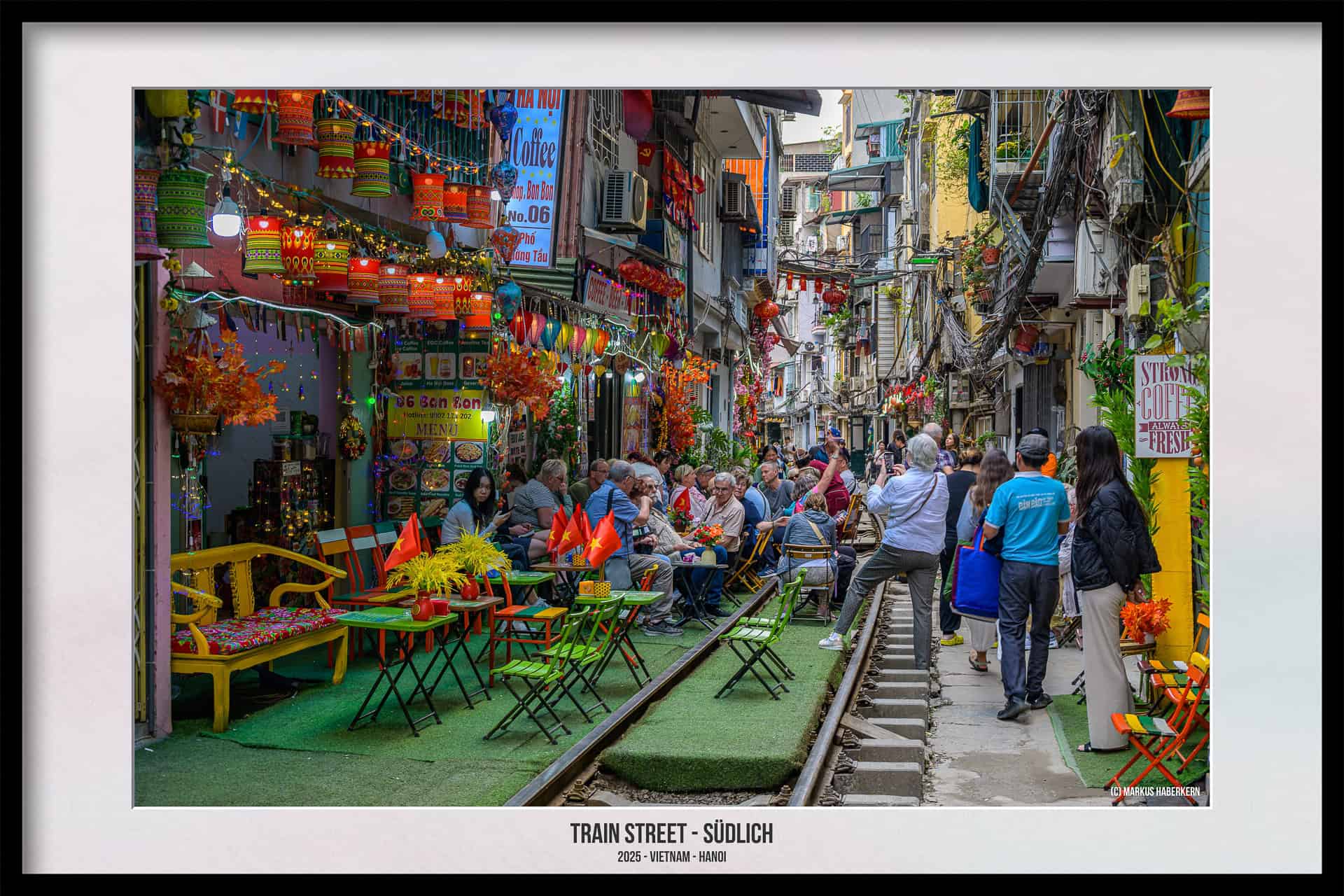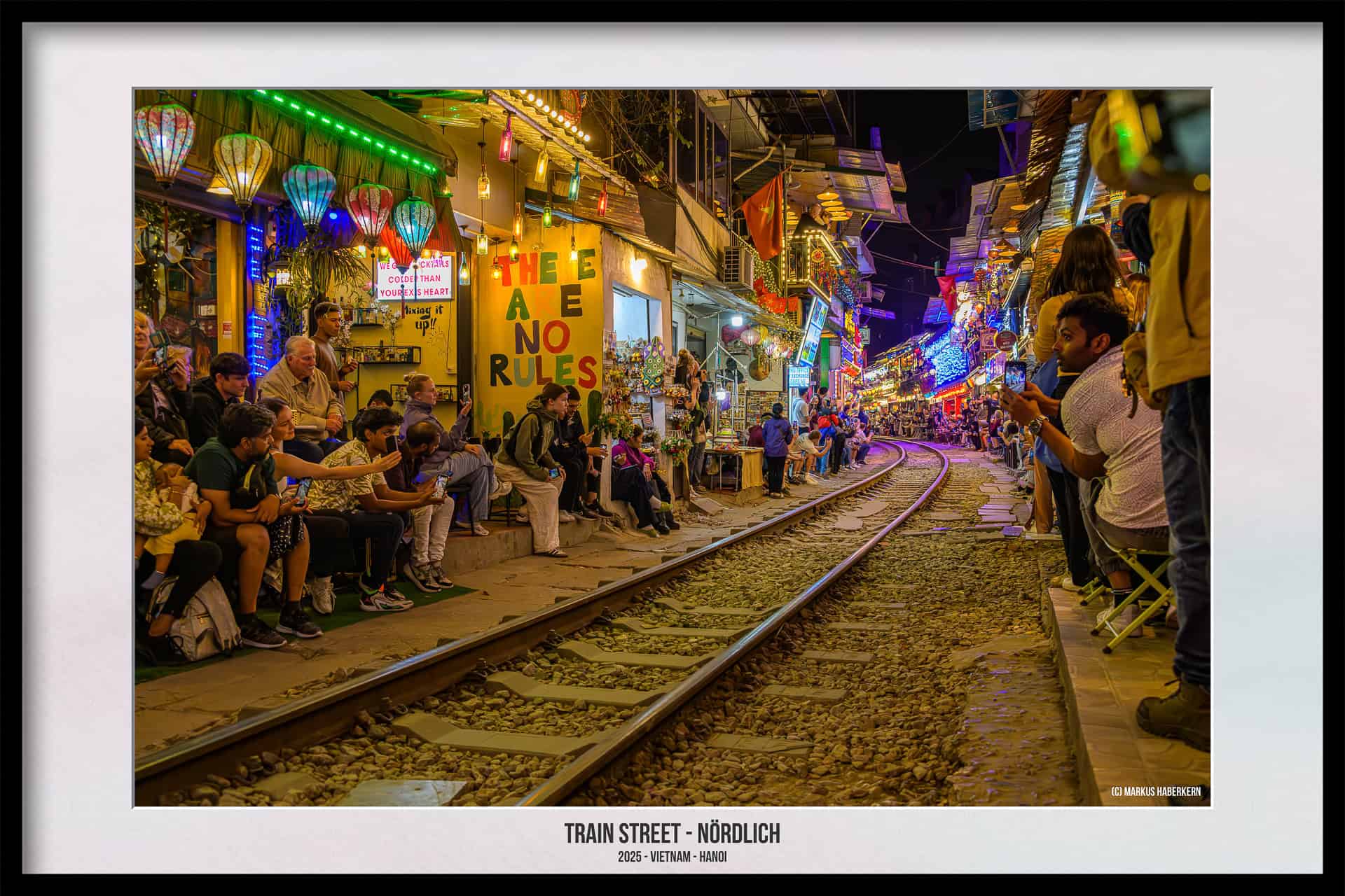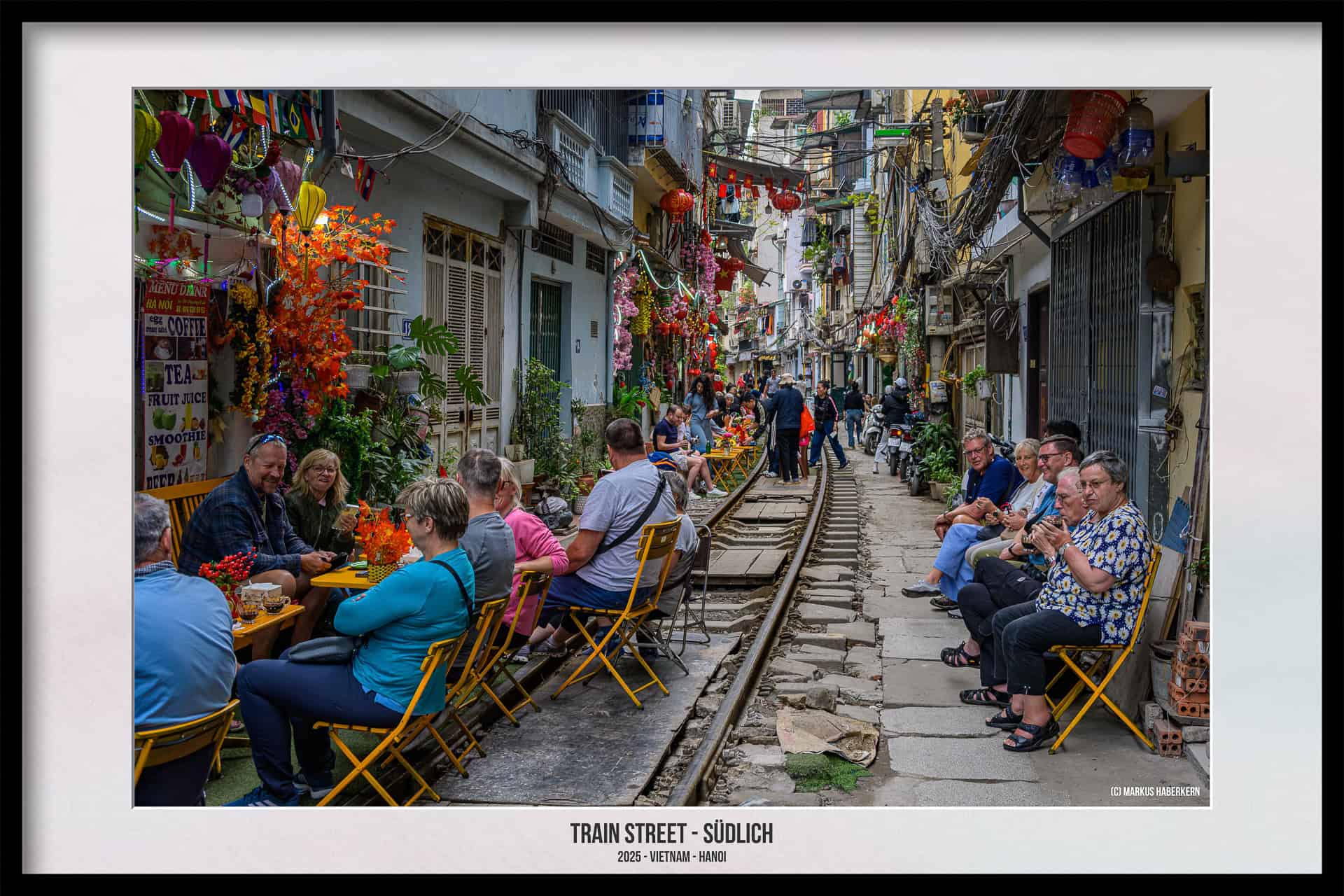 Die Geschäftsleute der Cafes und Einkaufsläden achten auf die Einhaltung der Sicherheit. Sie sind dabei sehr engagiert, ist doch der ungestörte Betrieb der Strecke in ihrem eigenen Geschäftsinteresse. Und in eurem Interesse sollte es liegen, euch nicht in Gefahr zu bringen. Es gibt keinerlei Absperrungen und die in vielen Reiseführern beschriebene gelbe Linie, gewissermaßen als Sicherheitslinie, haben wir bei unseren Besuchen im Jahr 2025 nicht gesehen.