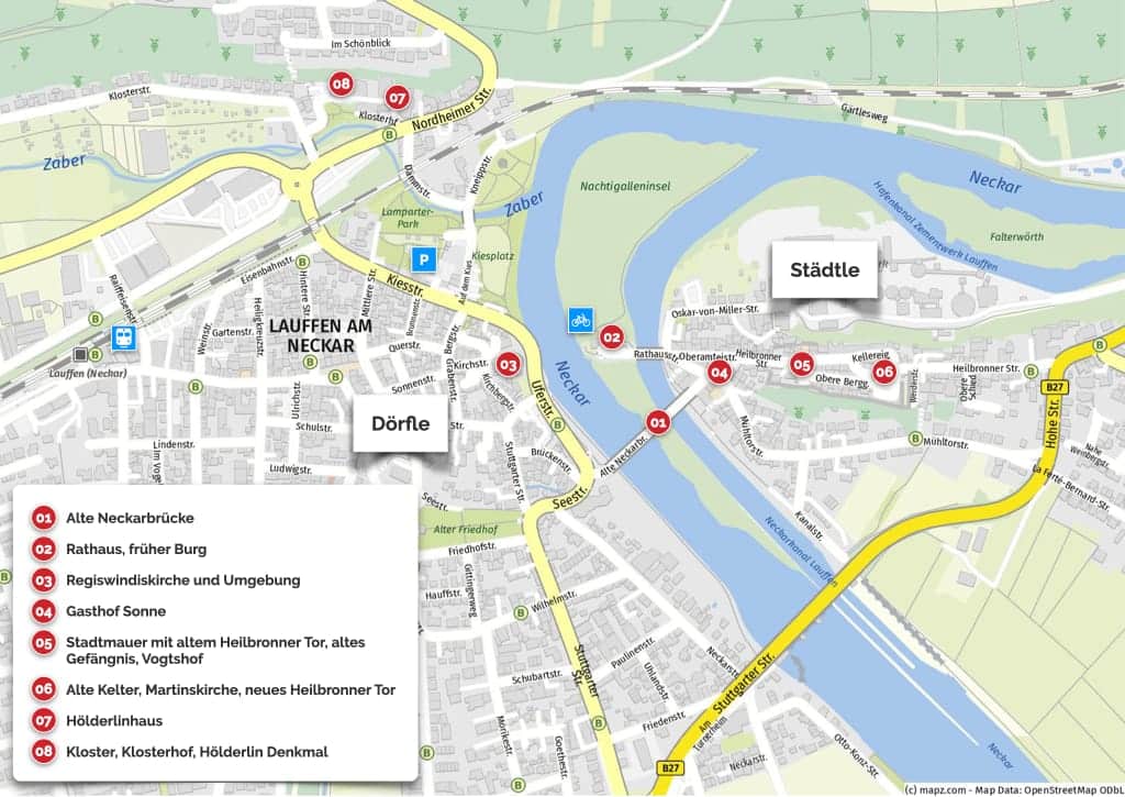 Lauffen kann recht einfach mit öffentlichen Verkehrsmitteln, mit dem Pkw oder auch mit dem Fahrrad erreicht werden. Der Bahnhof ist nur wenige hundert Meter von den Sehenswürdigkeiten entfernt.