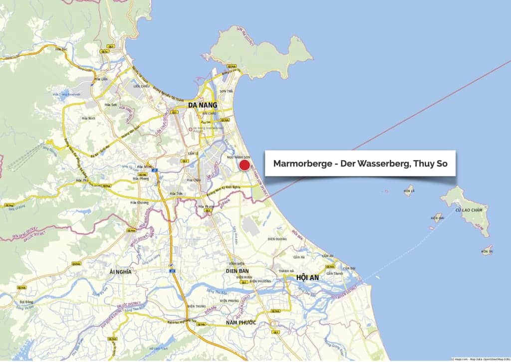 Die Marmorberge liegen verkehrsgünstig an der Hauptverbindungsstraße non Da Nang nach Hoi An, etwa 10 Kilometer südlich von Da Nang und etwa 20 Kilometer nördlich von Hoi An. Egal, wo ihr also eure Unterkunft habt, die Anreise mit einem Taxi, Grab (die vietnamesische Version von Uber) oder einem eigenen Fahrzeug ist nicht weit. Wir kamen mit unserem gemieteten Roller von Hoi An und die Fahrzeit war für uns etwas über 40 Minuten.